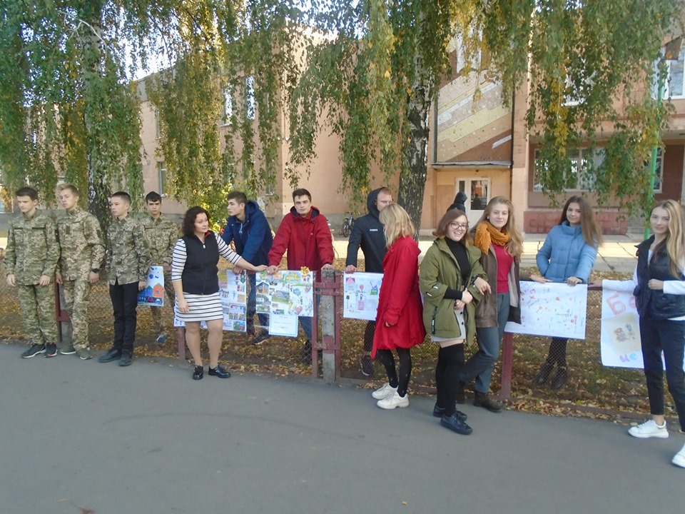 Щоб привернути максимальну увагу до теми безпеки на дорозі, команда розмістила плакати на паркані нашої школи, поруч з пішохідним переходом та світлофором. Протягом дня , 11 жовтня, водії та пішоходи мали змогу, зупинившись на світлофорі, ознайомитися з інформацією.